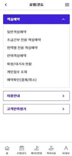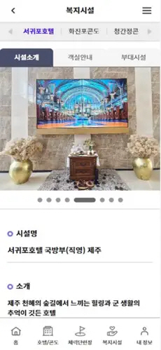 복지시설 안내: 국군복지회관, 휴양시설 등 다양한 복지시설을 소개하고, 해당 시설의 이용 방법 및 예약 방법을 안내합니다.